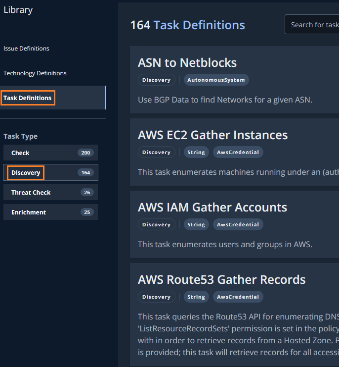 4.左ペインの Task Definitions をクリックすると、Task Type で Discovery を選択すると、Entity探索処理のタスクが確認できます。処理の詳細は非公開のため確認できませんが、どのような内容で探索を行っているかを簡単に確認してください。